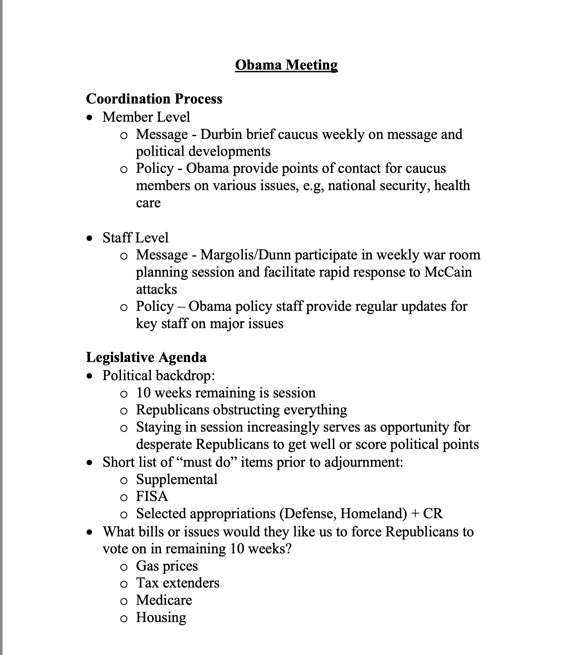 The other document I wanted to share was a memo written by Reid staffers to prepare him for a June meeting with Barack Obama, then a candidate for the presidency.