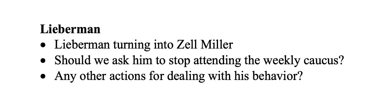 The stuff about Joe Lieberman is something else. The comparison to Zell Miller, the conservative Democrat who backed George W. Bush over John Kerry in 20024, is noteworthy, especially since Lieberman had already endorsed John McCain and would speak that summer at the GOP national convention. Reid’s kid gloves treatment of Lieberman, which would roil his caucus, was one of the most significant strategic moves of his career — the backstory is in the book. His asking Obama’s advice on what to do with Lieberman is interesting.