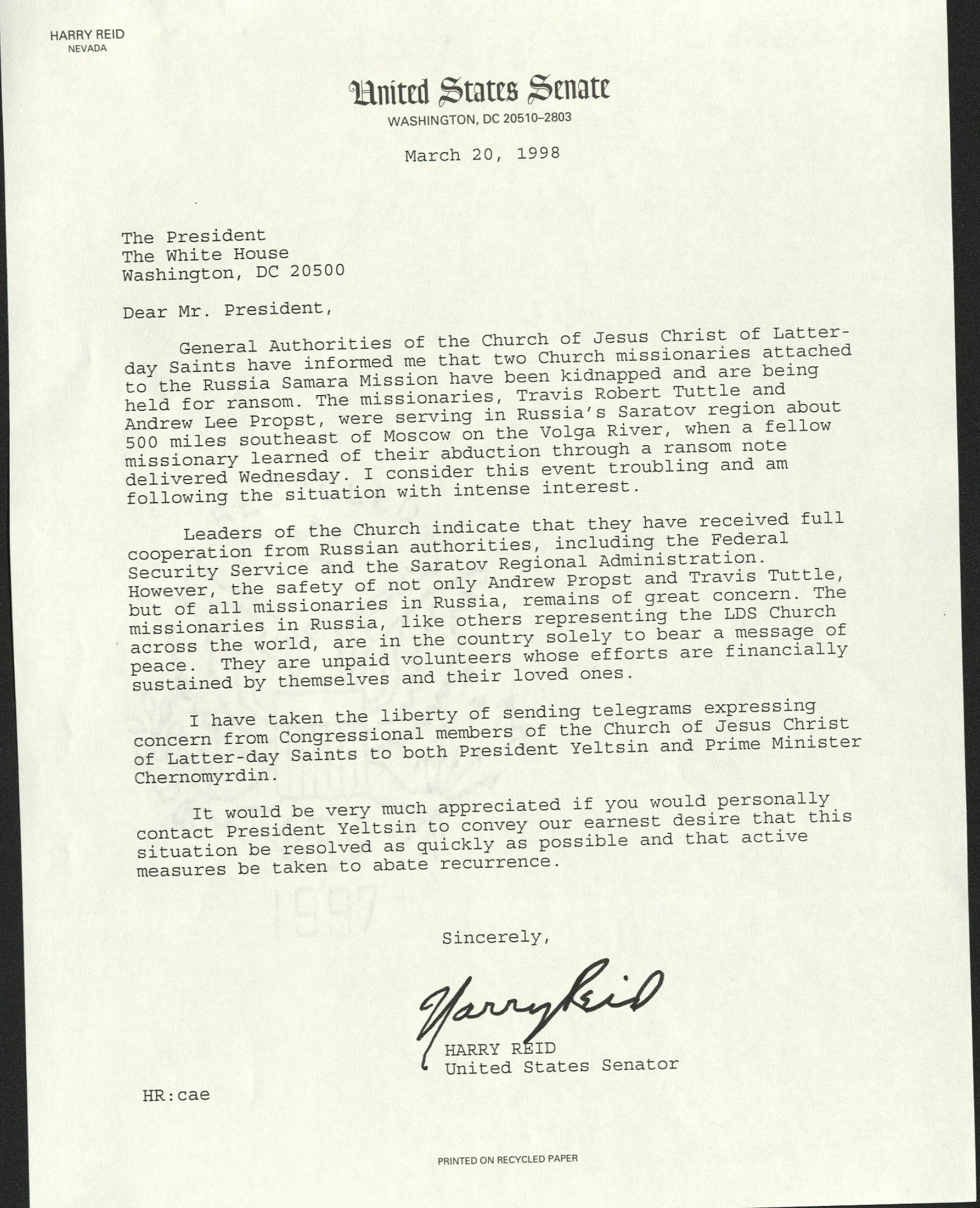Second document: One of Reid’s characteristics that I write about in the book was his LDS faith and how important it was to him — both spiritually and politically. He was more devout than people thought, and he also knew the power of the Mormon vote in Nevada. He would often be called on by church higher-ups for help, and he was close to prominent Mormons in Utah and Washington, DC. This is an example of his advocacy as he wrote a letter to then-President Bill Clinton in 1998 on behalf of some endangered Mormon missionaries. He also said he had written to then-Russian President Boris Yeltsin.