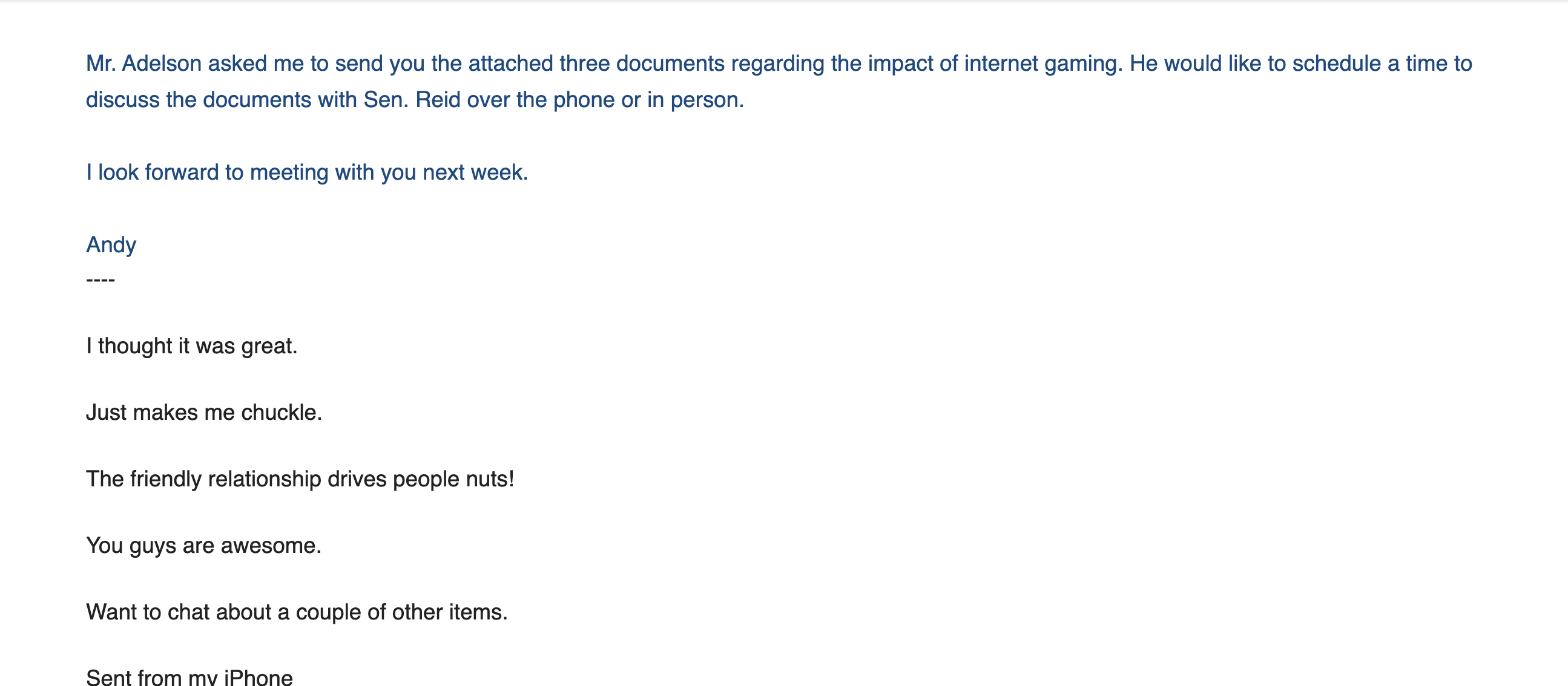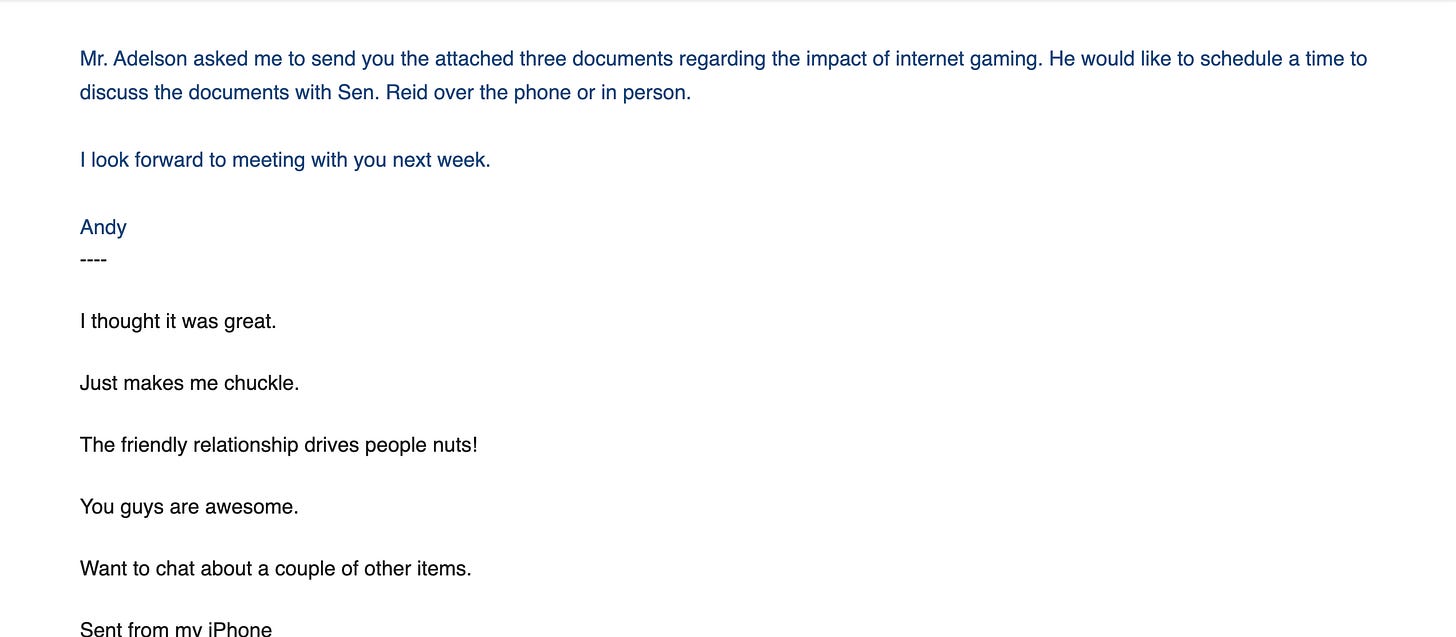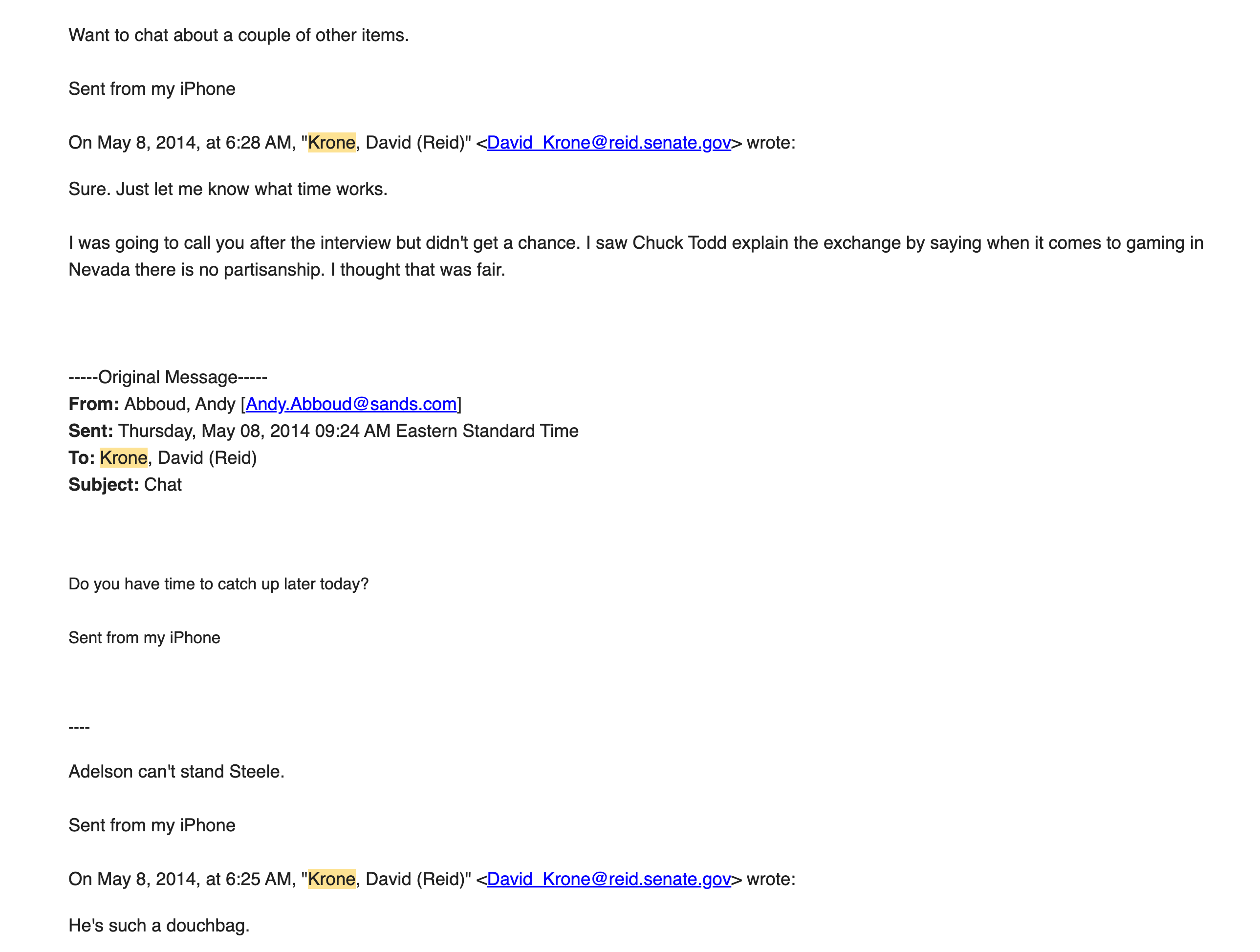 First, one of the sub rosa relationships Reid had — and I touch on this in the book — was with the late Sheldon Adelson, the GOP megadonor. Reid and Adelson clearly liked and respected each other, and Reid once drew a distinction between Adelson and the Koch brothers, which infuriated ex-RNC Chair Michael Steele, who is now on MSNBC. Reid aide David Krone and Adelson lieutenant Andy Abboud also developed a relationship, and in snippets of an exchange below, you can see that Adelson, who was opposed to Internet gambling, tried to influence Reid, who was involved on behalf of other Strip companies in trying to help them pave the way for web gaming. This was a classic example of Reid playing the “no permanent friends, no permanent enemies game,” and Adelson never went after Reid in his campaigns.